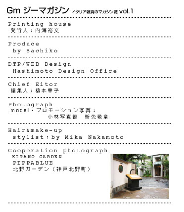 | スタッフ | ![]() Staff Printing house /Hirofumi Utsumi Produce by Sachiko DTP/WEB Design /Hashimoto Design Office Editorial designer /Hashimoto Photograph model /Kobayashi Photostudio Hair&make-up stylist:by Mika Nakamoto Cooperation photograph KITANO GARDEN ※本誌掲載の写真・イラストおよび記事等の無断転記掲載を禁じます |